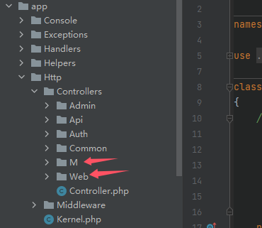 1、在app\http\Controllers文件夾里面創(chuàng)建PC端和移動端不同的控制器文件夾,分別對應PC端的路由文件及移動端路由文件