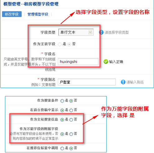 接下來添加萬能字段 tenement 的附屬字段,并在字段設(shè)置中,選擇為萬能字段附屬字段,以戶型室huxingshi為例,其它附屬字段同樣的操作,如下圖所示: