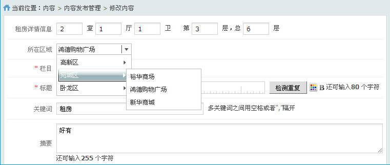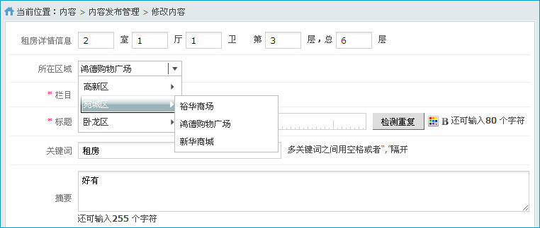 添加完成以后,在模型應(yīng)用欄目,添加信息時,就會出現(xiàn)聯(lián)動菜單選擇框,效果如下圖所示: