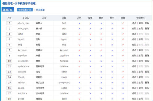 每個模型都有多個的屬性,每個屬性都屬不同的字段類型,我們可以通過模型字段管理來增減字段,并為字段選擇類型,來自定義出自己所需模型,如下圖所示: