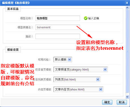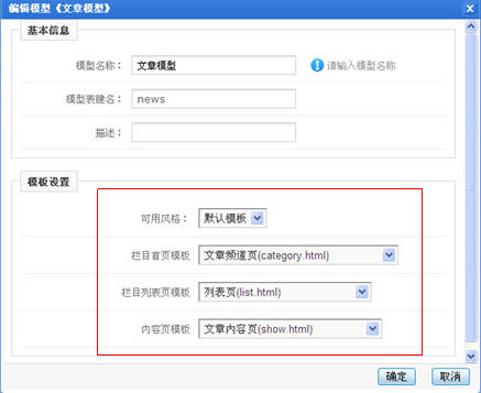 每個模型都可以指定對應(yīng)的默認模版,添加欄目時選擇對應(yīng)模型,可默認加載模型對應(yīng)模版。如下圖所示: