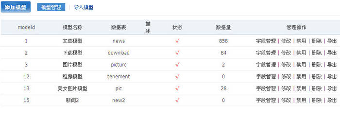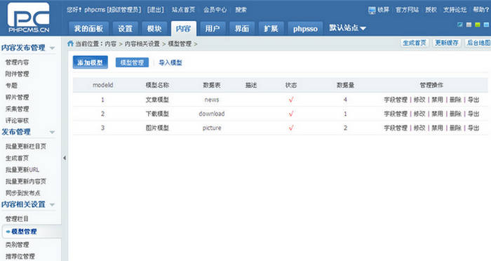 PHPCMS V9 內(nèi)置新聞、圖片、下載三種模型,每個模型都分別自定義不同的屬性,并可以為模型指定默認模版列表。