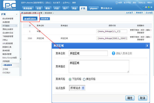 下面我們以為租房模型添加一個所在區(qū)域聯(lián)動菜單為例,說明聯(lián)動字段的使用, 首先添加聯(lián)動菜單數(shù)據(jù),并選擇菜單風(fēng)格和應(yīng)用站點范圍(V9 支持多站點站群系統(tǒng)),如下圖所示: