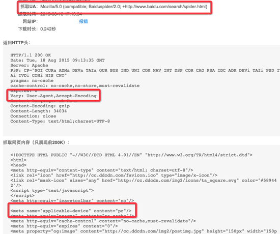 Vary header 加上之后,為了讓百度更好地識別我們的頁面是 PC 還是 Mobile,就需要使用百度自定義的這個 Meta applicable-device 標簽了。注意以下來自百度的消息: Meta applicable-device 標簽,并非是站點必須標注的,現在很多站點沒有標記這個標簽情況也很好。但這個標簽可以幫助百度校驗自己的判斷,并及時進行修正。做這個事情又不麻煩,所以我們建議代碼適配站點為了保證效果,還是加這個標簽。