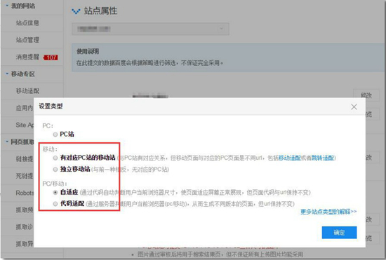 百度站在平臺的設置里,把網站分為了五類:PC站;有對應PC站的移動站;獨立移動站;自適應的站點;代碼適配的站點。根據站點實際情況進行設置,有利于百度蜘蛛在抓取頁面,以及搜索結果的排名(PC站和M站的搜索結果展現機制不一樣)。設置方法如下: