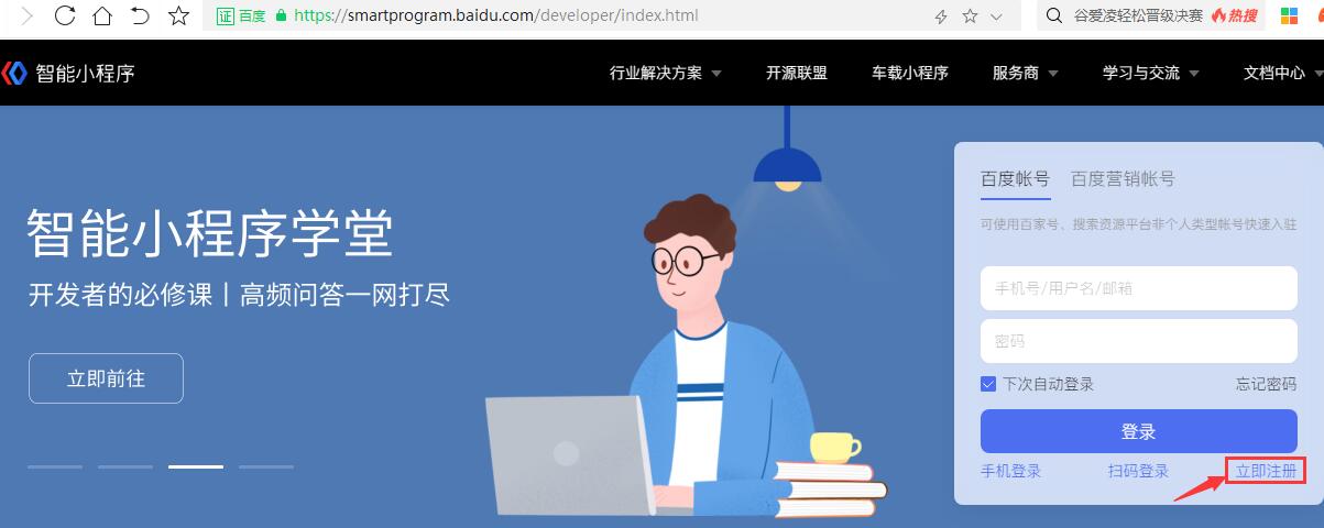 (1)登錄百度小程序官方網(wǎng)址 https://smartprogram.baidu.com/developer/index.html,點“立即注冊”。