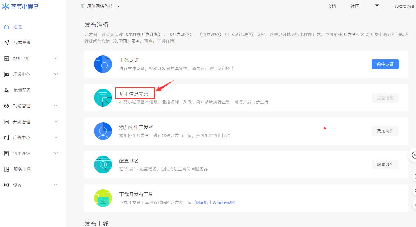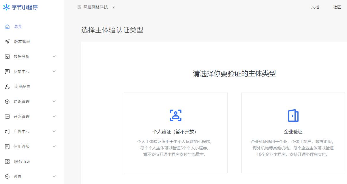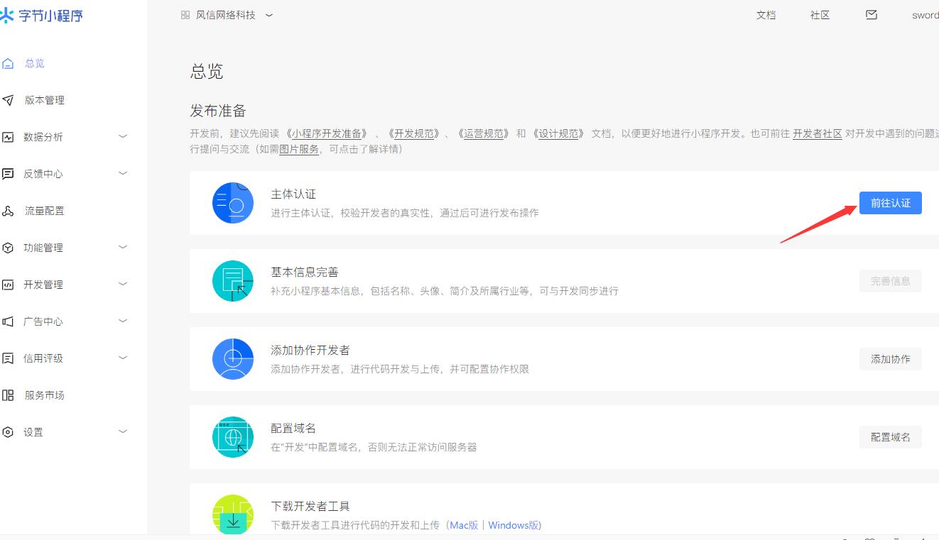 (1)創(chuàng)建完成后,自動進入到【小程序總覽頁】,點擊【去認證】,進行主體認證。