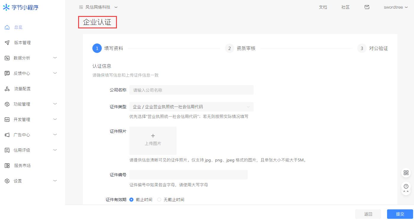 企業(yè)級認證有三個步驟:填寫資料-資質(zhì)審核-對公驗證,請根據(jù)提示完善信息。