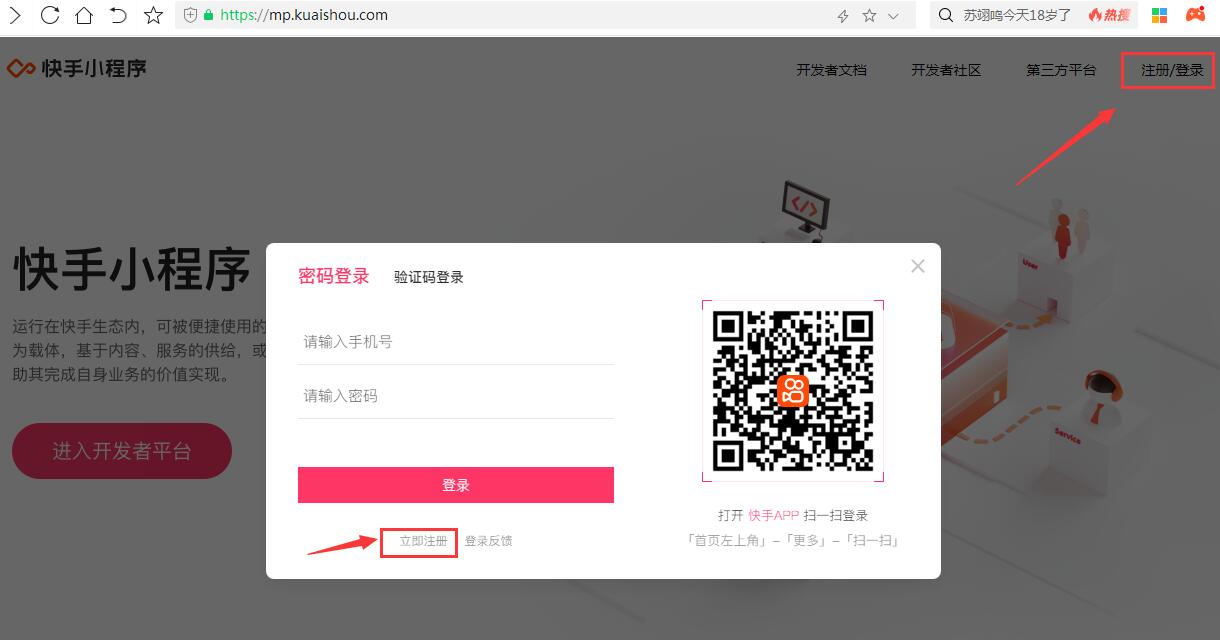 (1)登錄快手小程序官網(wǎng) https://mp.kuaishou.com/ 點擊右上角“注冊/登錄”,“立即注冊”,進行帳號注冊。