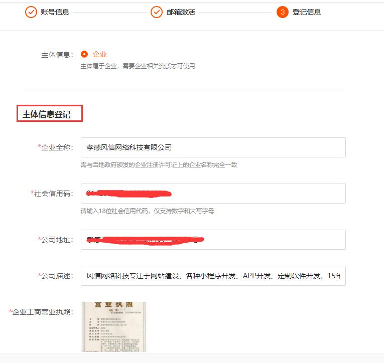 填寫“主體信息登記”,企業(yè)全稱,社會信用碼,公司地址,公司描述,上傳工商營業(yè)執(zhí)照